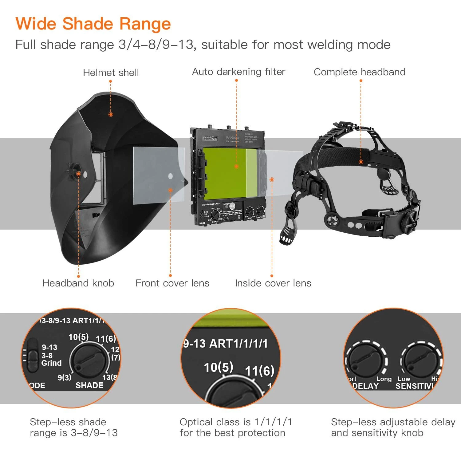 Flexible Einstellung – Sie können den Helm durch die Einstellung der Seite Knopf in der Oberfläche zu fixieren oder machen es für Ihren Kopf durch die Einstellung des Knopfes auf der Rückseite geeignet. die variable Schattenbereich (3,3-8,9-13) kann auch nach Ihrer Art von Schweißarbeiten geändert werden. auch, können Sie die Verzögerungszeit und die Empfindlichkeit der Schweißhaube automatische Verdunkelung Funktion einstellen.