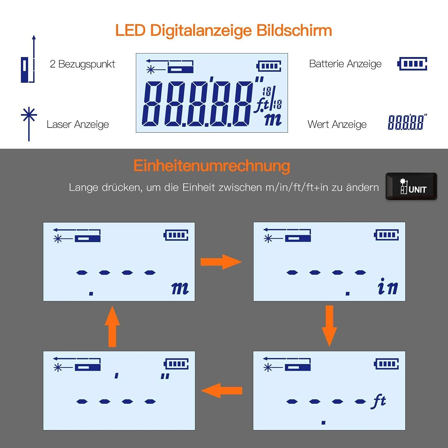 - 2 einzelne Laserapertur + LCD-Display: Doppelte Detektionslöcher verbessern die Messstabilität erheblich. Über das LCD-Display können Sie die Laserentfernungsnummern schnell ablesen. Fühlen Sie sich frei, zu M/In/Ft zu wechseln
