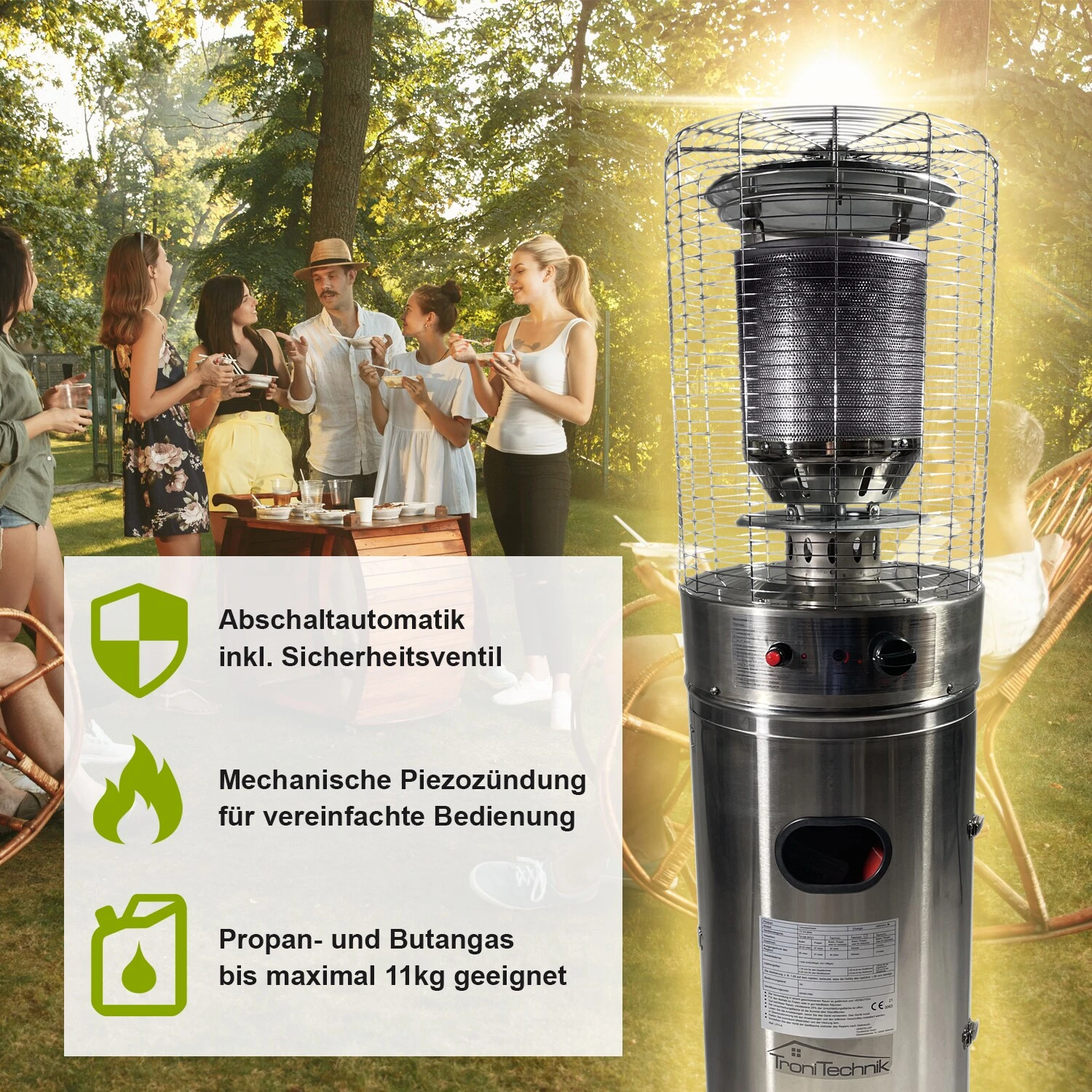 Dieser qualitativ hochwertige Gasheizer kann beliebig genutzt werden. Sei es für die Terrasse, den Balkon oder im Freien. Gleichzeitig verlängert dieser jeden Aufenthalt und sorgt für ein verbessertes Wohlbefinden.