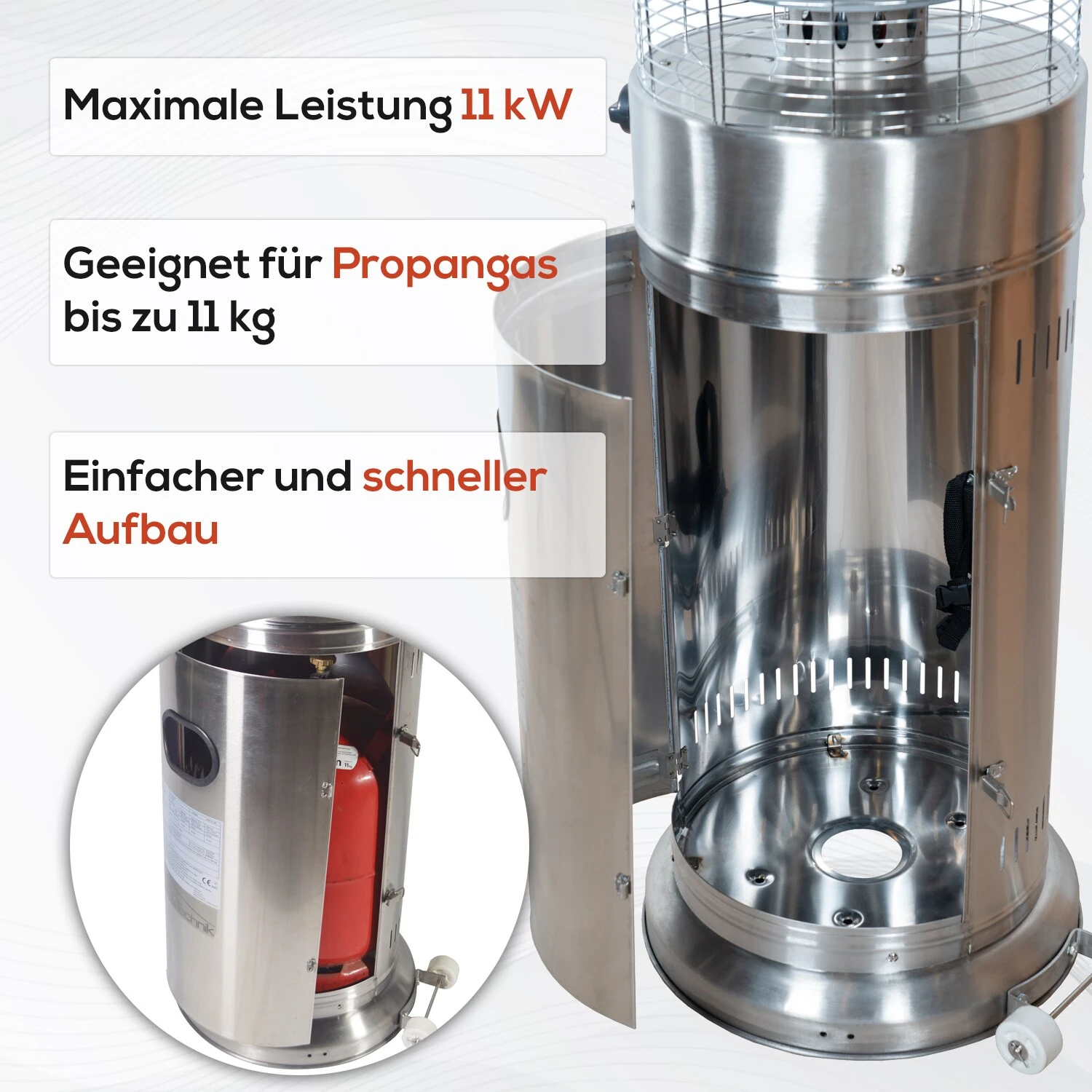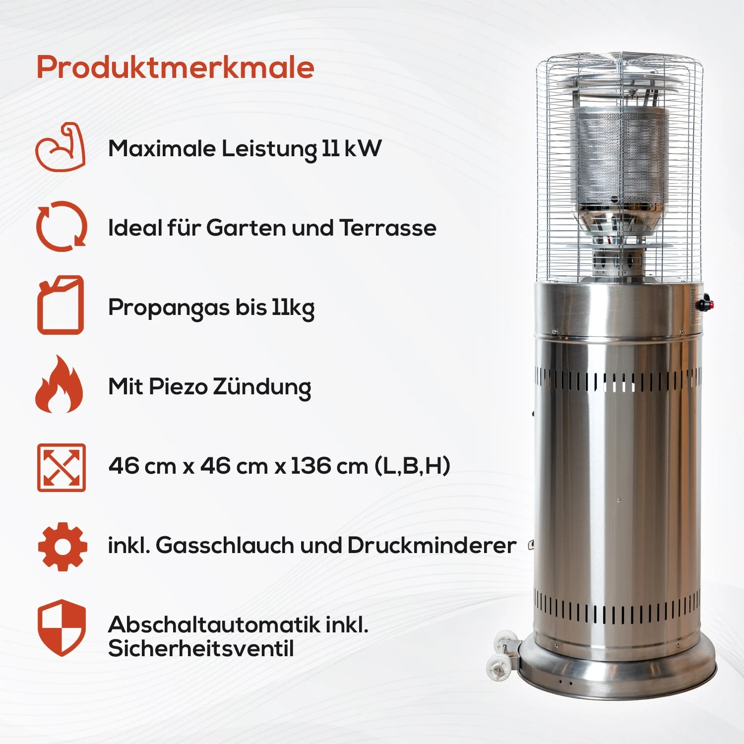 Der Terrassenheizer besitzt eine stufenlose Wärmeregulierung und bietet eine maximale Leistung von 11 kW. So können Sie nach eigenem Interesse den Gasverbrauch, sowie die ausströmende Wärme regulieren.