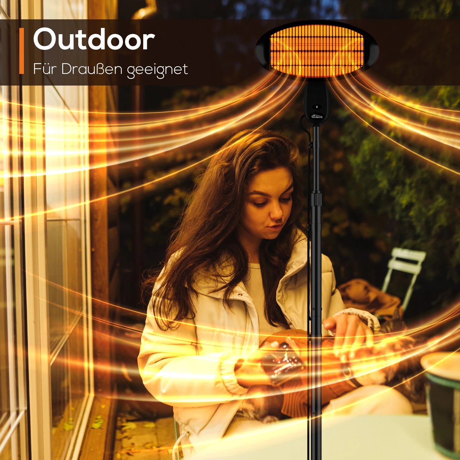 Ebenfalls beliebig wählbar ist die Höhe des Heizstrahlers dank der verstellbaren Teleskopstange, sowie einstellbarem Neigungswinkel des Heizkopfes bis zu 45 Grad.
