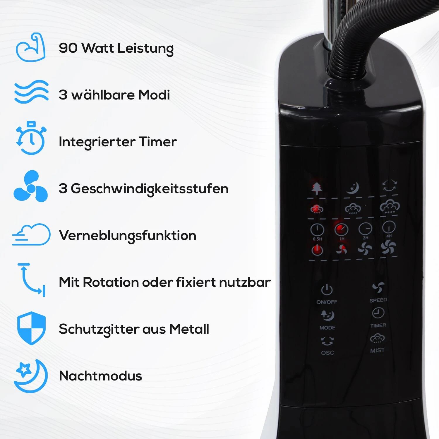 Der verbaute Vernebler nutzt Wasser aus dem Wassertank und verteilt dieses auf Wunsch mit feinem Nebel bis zu einer Raumgröße von bis 32m².