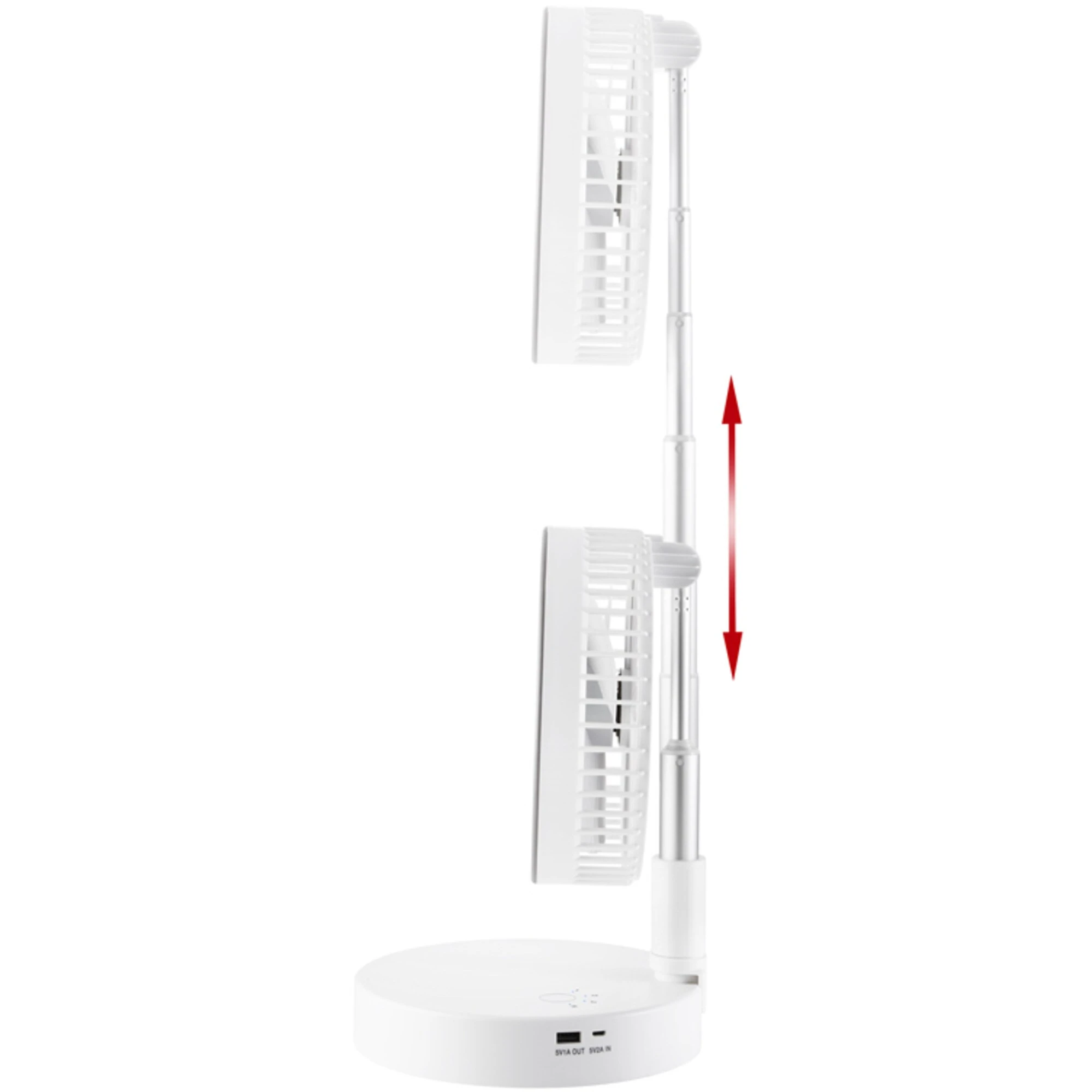 Der TELESKOP-VENTI Cordless von Unold macht sich ganz klein, wenn er nicht benötigt wird. Durch den praktischen Klappmechanismus kann er platzsparend „zusammengefaltet“ werden, wenn keine Frischluft gewünscht ist. Seine ausziehbare Teleskop-Halterung sorgt für Flexibilität: Die Höhe ist stufenlos zwischen circa 15 bis 75 cm einstellbar. Mit 3 Geschwindigkeitsstufen liefert der Ventilator immer Frischluft passend zur Temperatursituation. Durch den verstellbaren Neigungswinkel sorgt das Gerät zielgerichtet genau dort für eine erfrischende Brise, wo sie gewünscht wird. Mit dem Naturmodus kann eine wechselnde Lüftergeschwindigkeit zugeschaltet werden. Der Ventilator wird von einem Akku betrieben, der je nach gewählter Geschwindigkeitsstufe für circa 4 bis 10 Stunden die erforderliche Power liefert. Zur Der stabile Standfuß vom TELESKOP-VENTI Cordless kann auch als Powerbank verwendet werden.