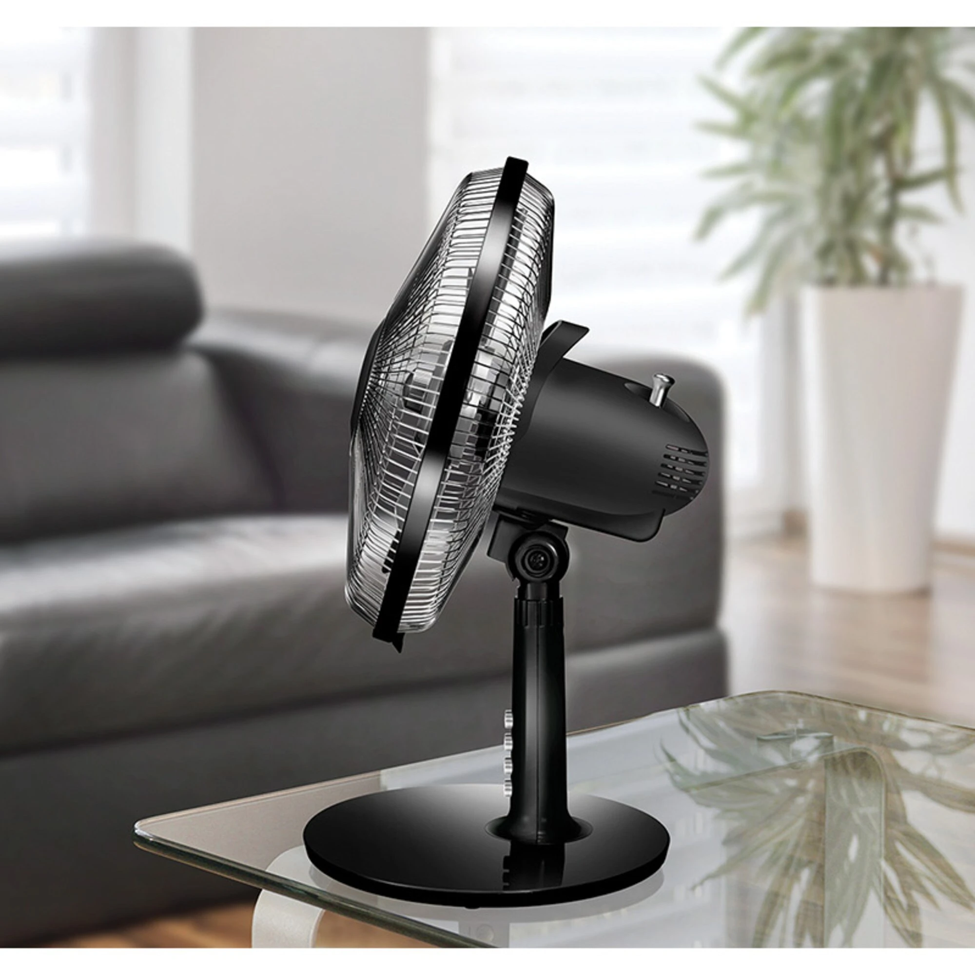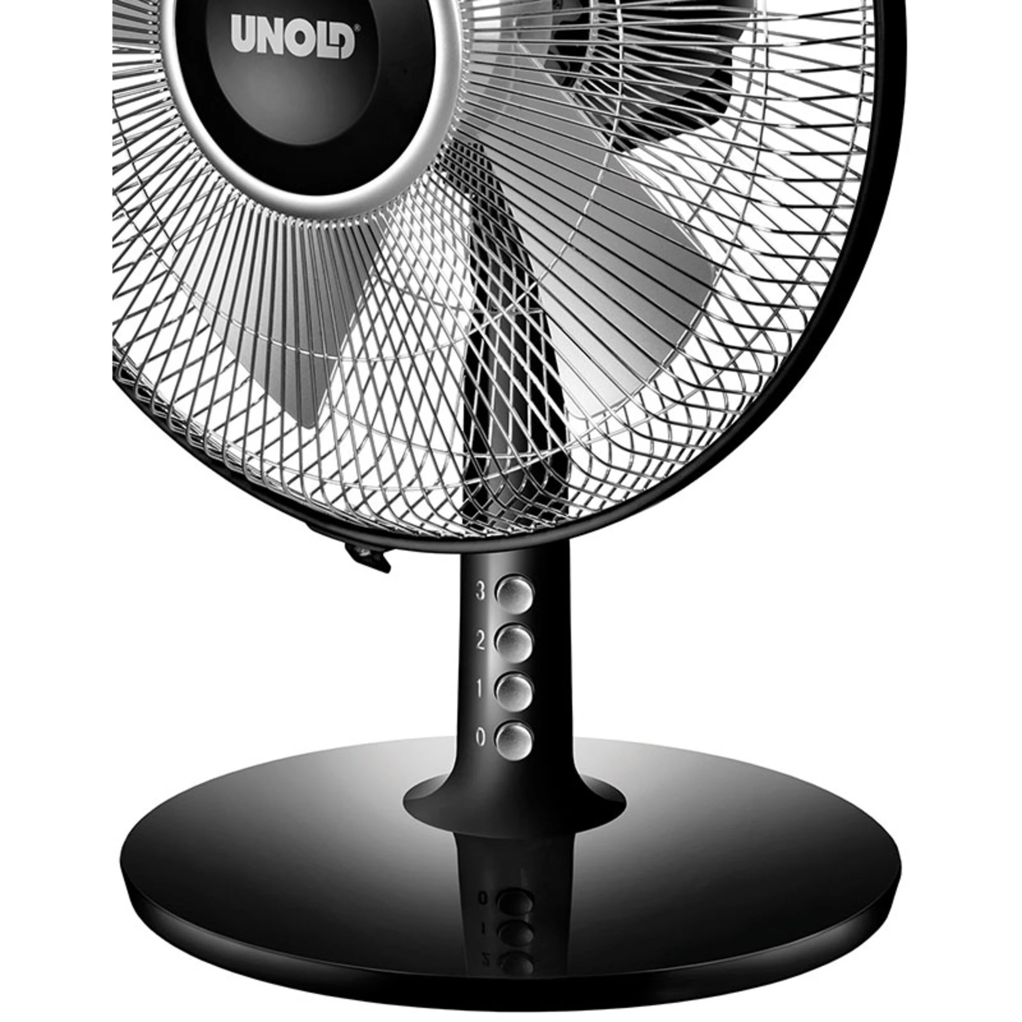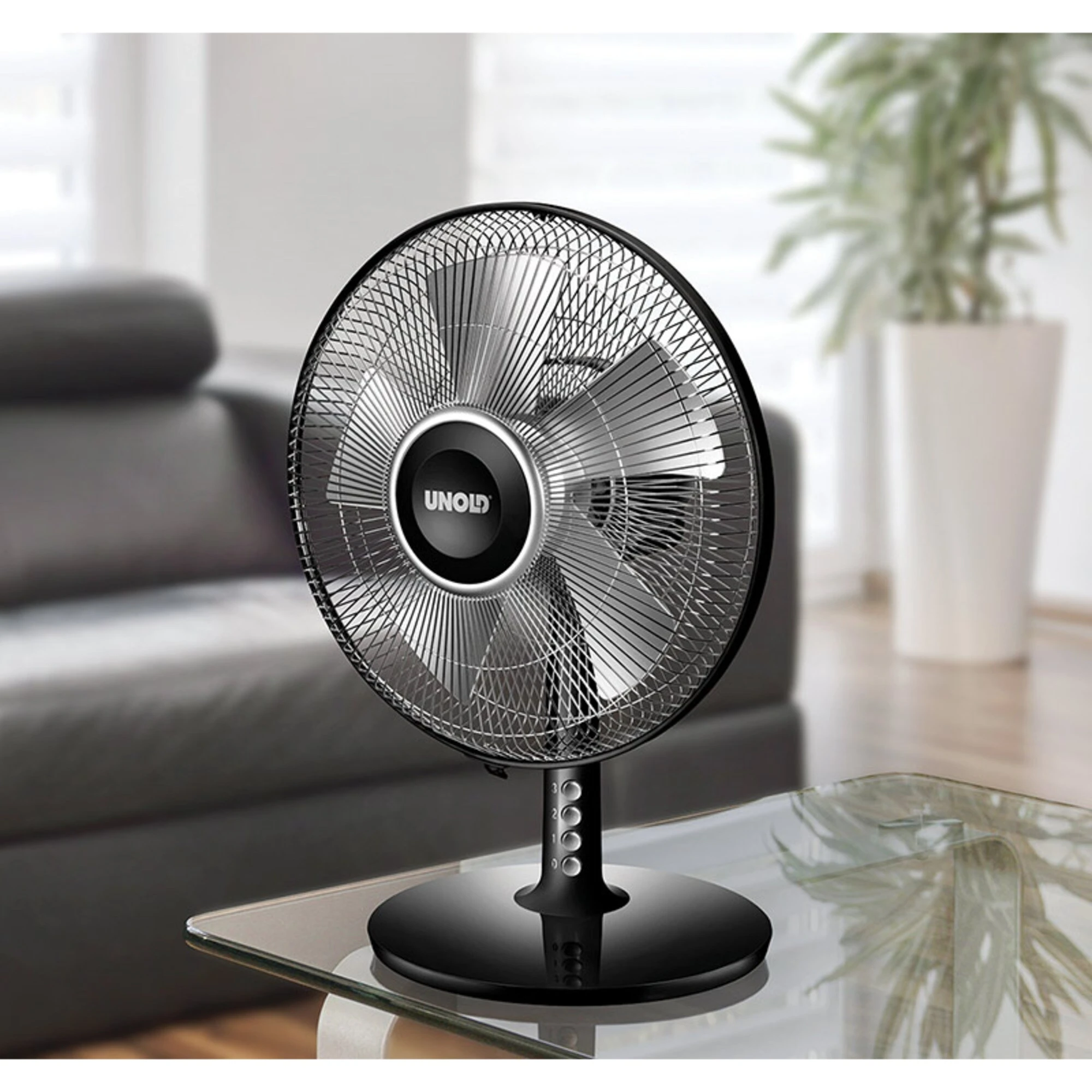 Der Tischventilator 86818 Silverline von Unold bietet drei, per Tastendruck, wählbare Geschwindigkeiten bei einer Leistung von 40 Watt. Seine 5 ärodynamische Lüfterflügel sorgen hinter einem Schutzgitter für optimale und geräuscharme Luftzirkulation. Die Oszillation ist zuschaltbar und der Neigungswinkel verstellbar. Es besitzt einen praktischen Tragegriff am Gehäuse.