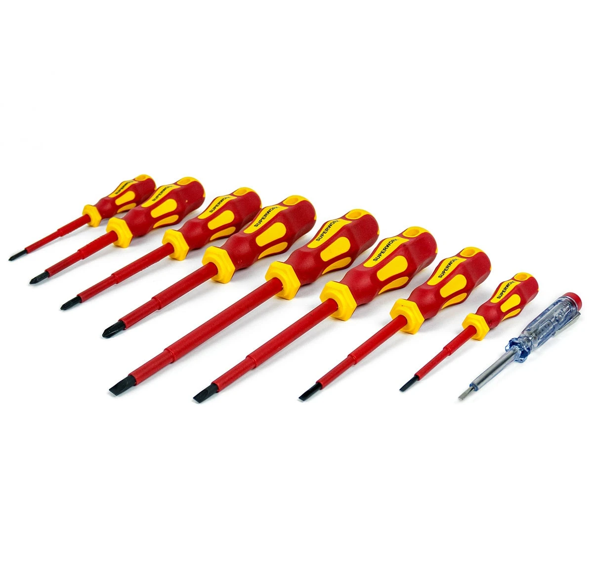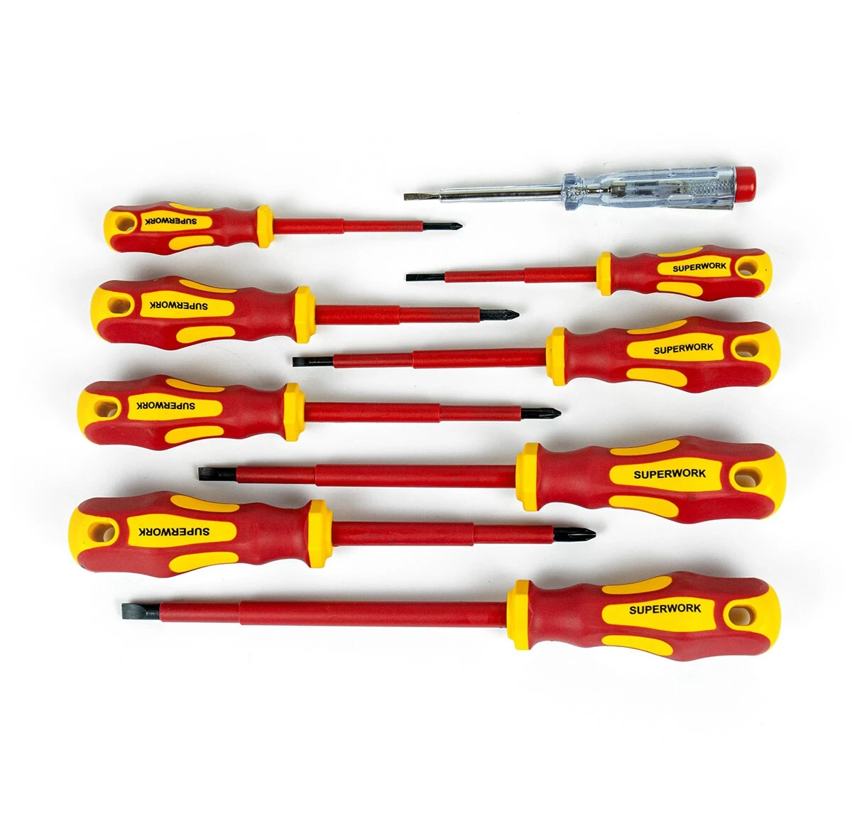 Hochwertiger, isolierter Elektro-Schraubendreher Satz mit 9 Teilen im praktischen Kunststoffkoffer.