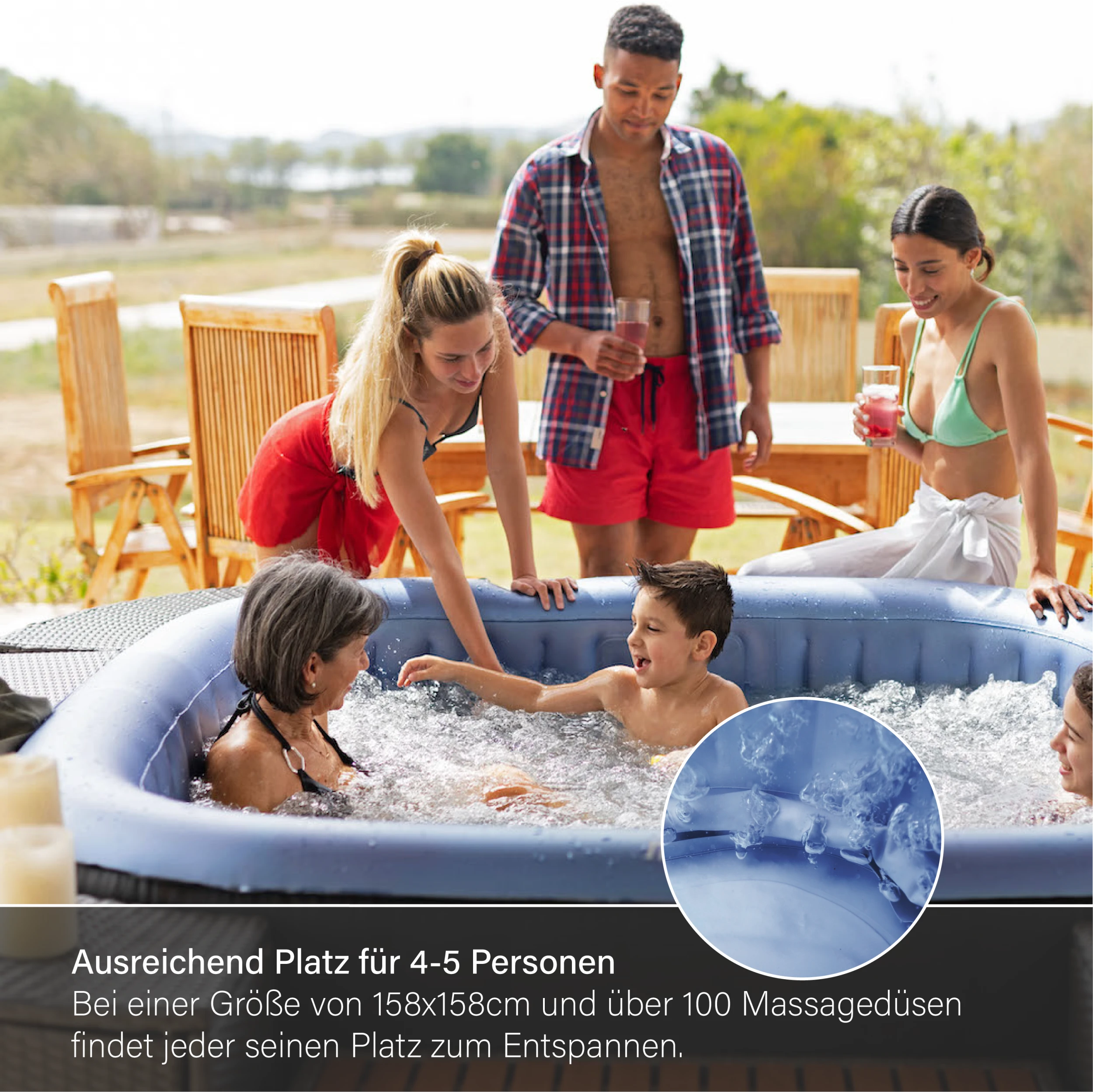 Ausreichend Platz: Bei einer Größe von 158 x 158 cm ist ausreichend Platz für 4 bis 5 Personen geboten und der Pool findet dank quadratischer Form auch in schwierigeren Raumverhältnissen seinen Platz. Selbst ein Balkon ist kein Problem.