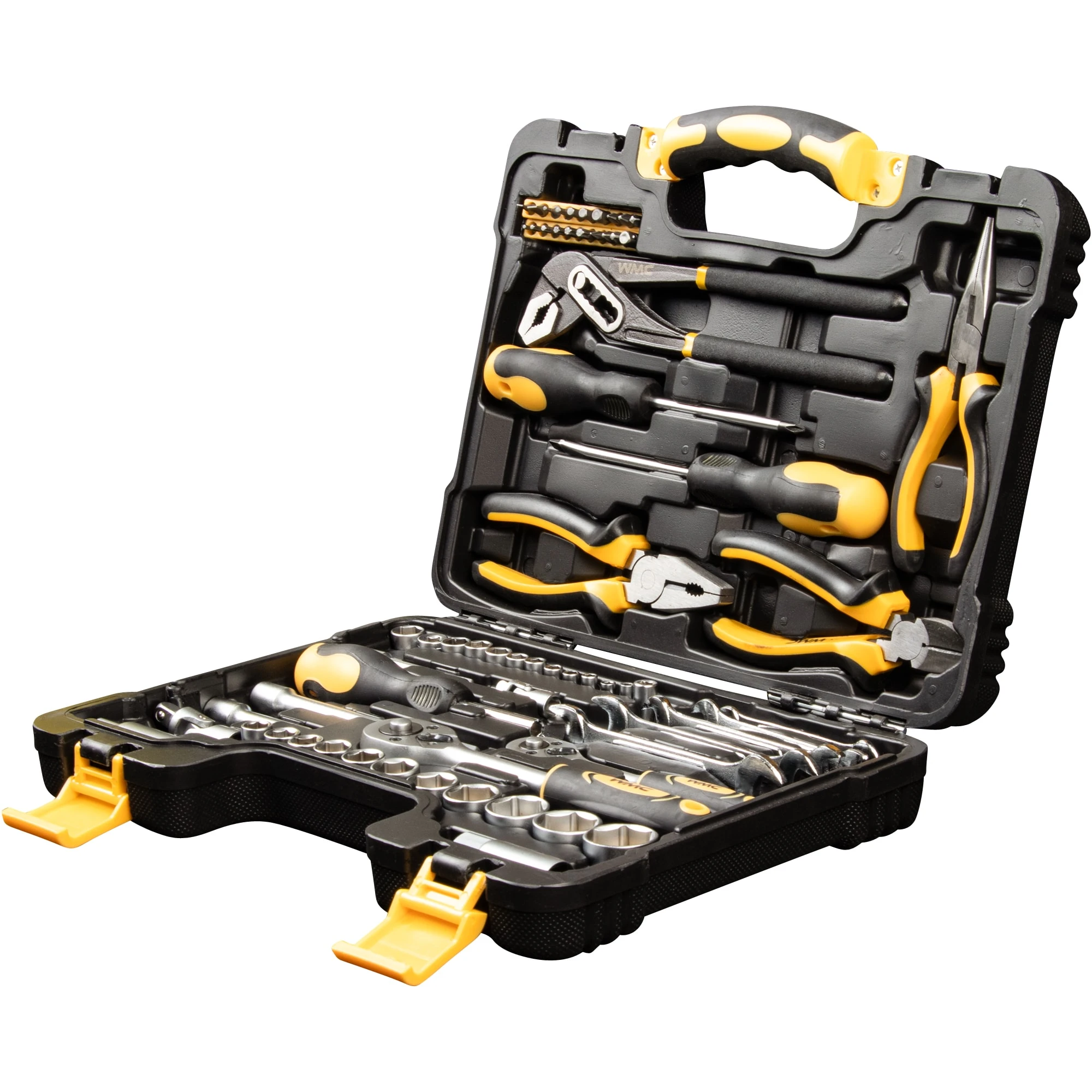 Im Set enthalten sind neben einer großen Auswahl Steckschlüssel und Bitköpfe mehrere Schraubendreher, Zündkerzenschlüssel, Kardangelenke, verschiedene Zangen, Gabelschlüssel und viel mehr.