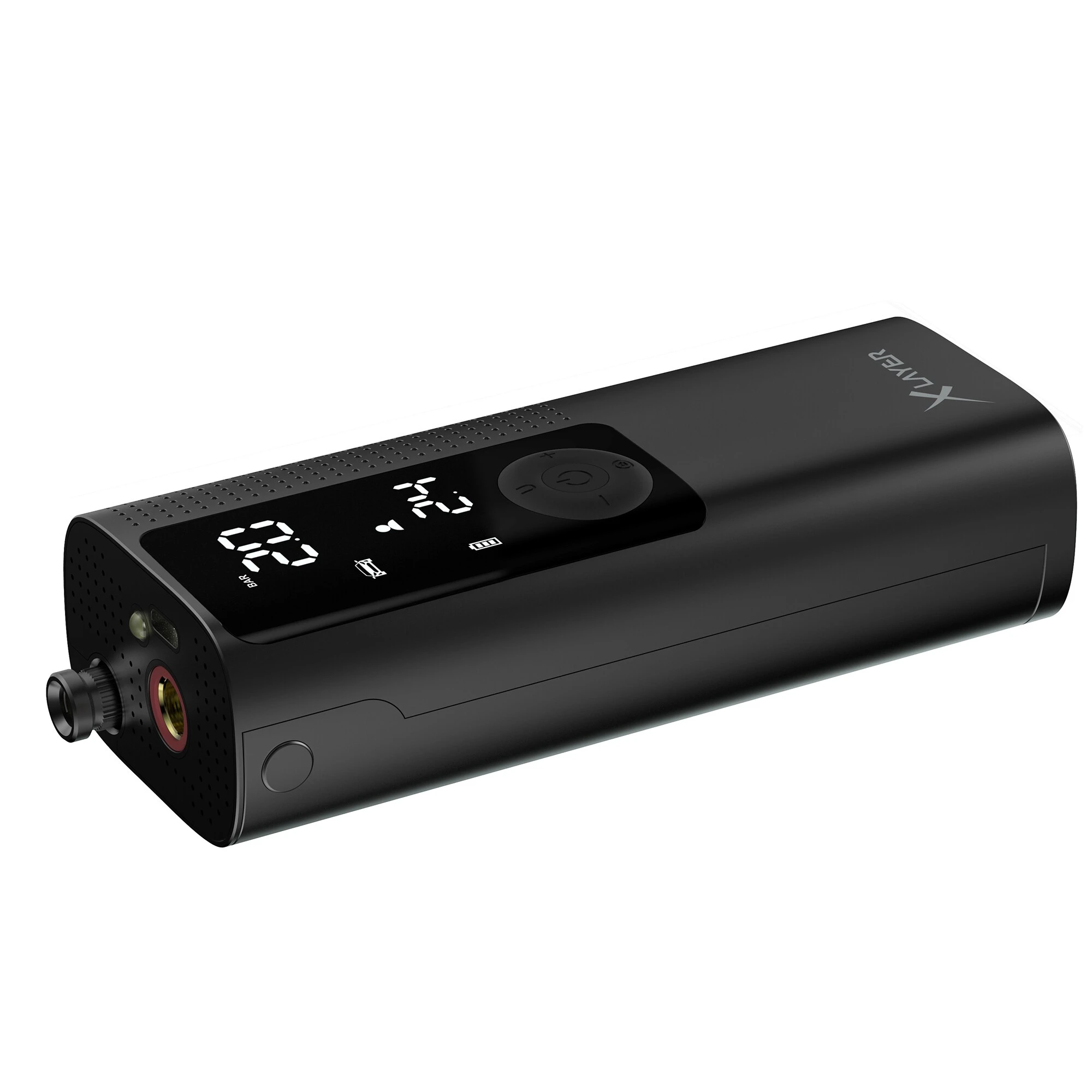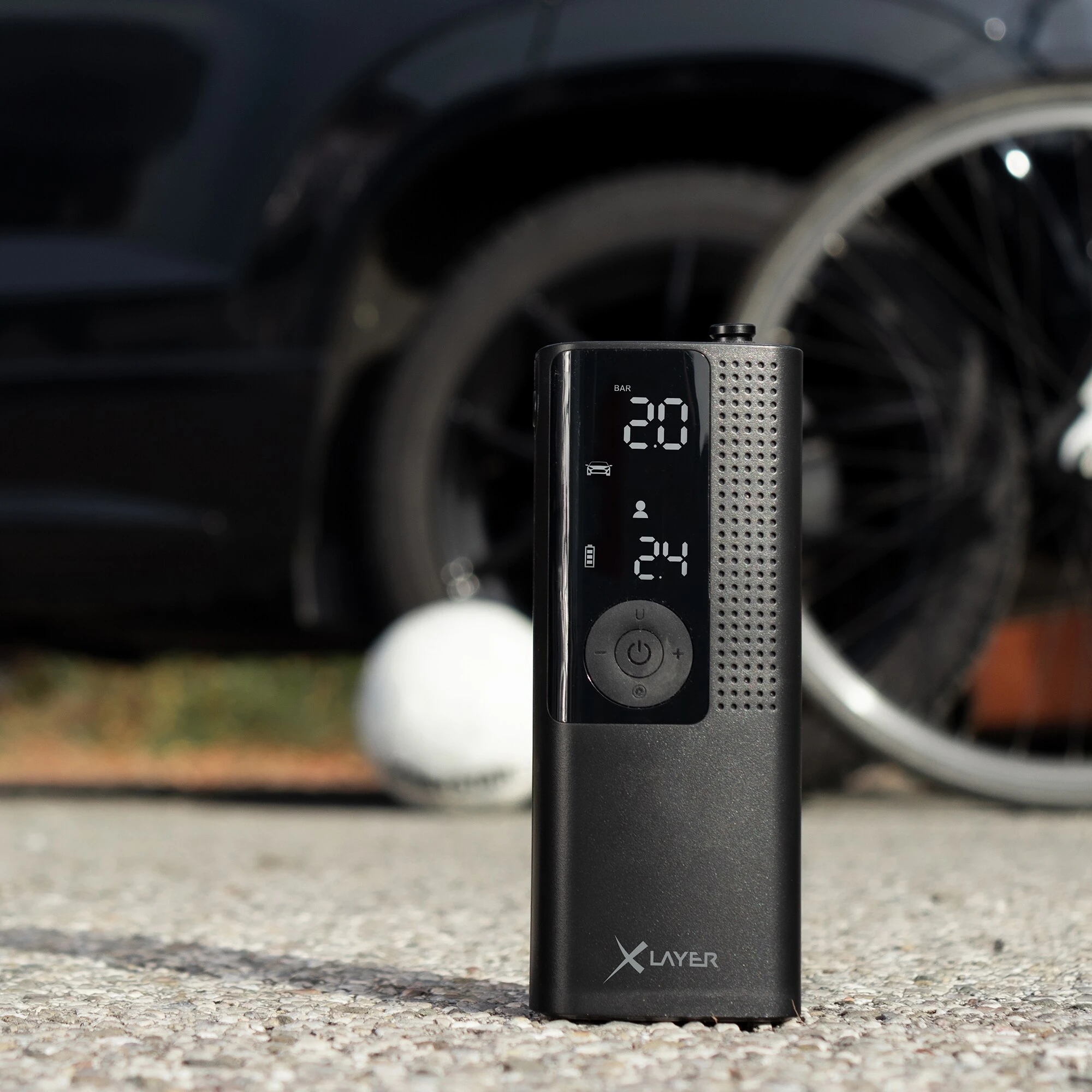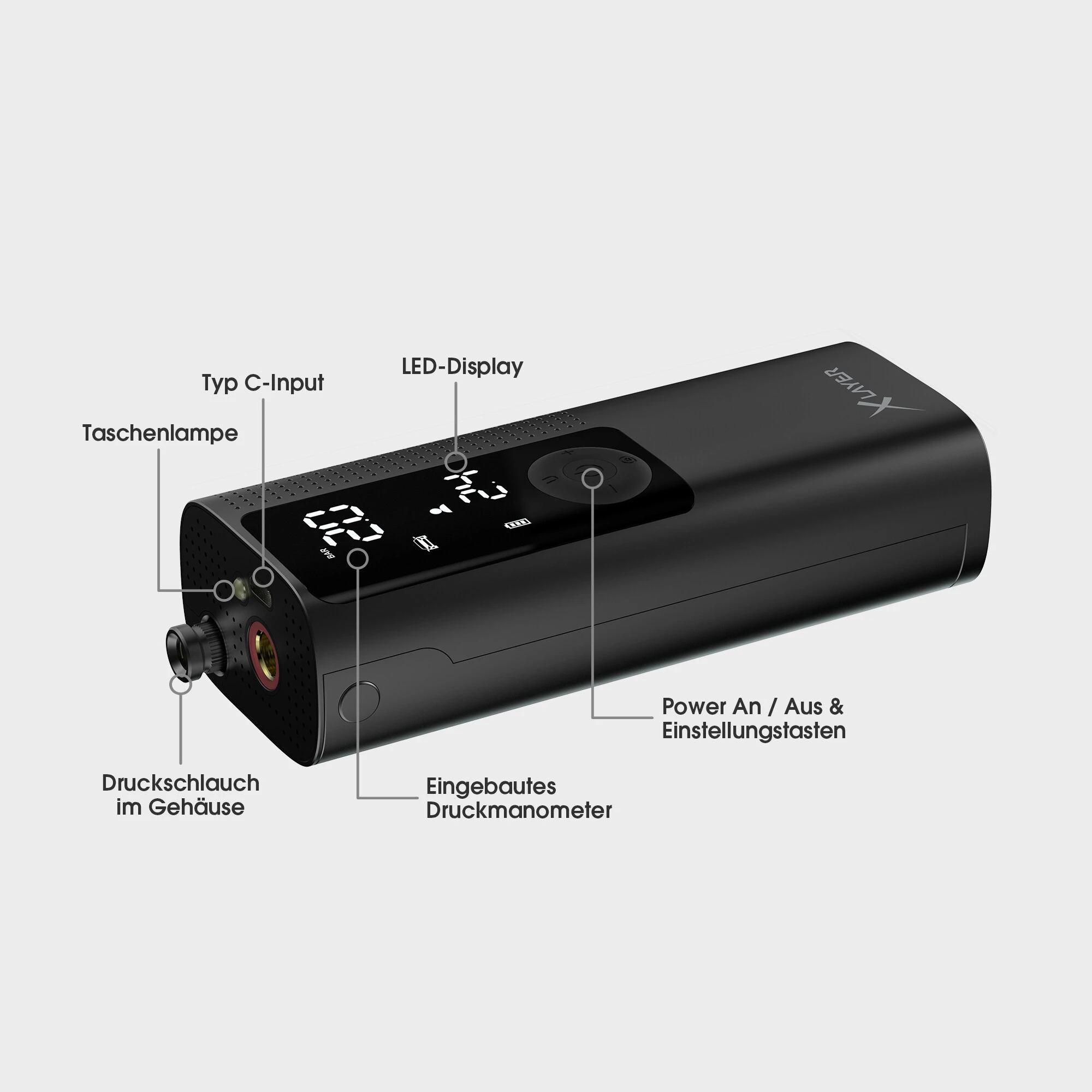 Der mobile Akku Luftkompressor ermöglicht komfortables Aufpumpen von Reifen, Bällen, Luftmatratzen u.v.m. Dank seiner kompakten Größe und seinem geringen Gewicht eignet dieser sich ideal für Fahrradtouren, Urlaube oder als ständiger Begleiter in Autos und bei Motorrädern. Der integrierte Lithium-Ionen-Akku liefert 2.000 mAh und sorgt somit für mehrfaches Aufpumpen von Auto-, Motorrad- und Fahrradreifen. Der mitgelieferte Schlauch lässt sich bequem im Inneren verstauen und schützt somit vor Verlust. Durch die im Lieferumfang enthaltenen Adapter lassen sich neben Reifen mit Autoventilen auch Fahrradreifen, Luftmatratzen und Bälle aufpumpen. Das mitgelieferte Micro-USB Kabel lädt den Akku-Luftkompressor in nur knapp 3 Stunden wieder voll. Dank des Drucksensors werden die aufzupumpenden Gegenstände vor Überdruck geschützt. Mehr Sicherheit dank richtigem Luftdruck: Der korrekte Druck auf Ihren Autoreifen spart nicht nur Kraftstoff, er ist auch wichtig für sicheres Fahrverhalten. Behalten Sie ihn daher jederzeit unter Kontrolle! Machen Sie sich unabhängig von Tankstellen: Sparen Sie sich ab sofort die regelmäßigen Anfahrten zu Luftdruck-Stationen! Kontrollieren Sie den Reifendruck bequem zu Hause – vor der Familienurlaubs-Fahrt, vor der ersten Motorrad-Tour im Frühjahr oder beim Räderwechsel. Nicht nur für Ihre Autoreifen: Auch den Druck von Fahrrad- und Motorradreifen kontrollieren Sie. Oder pumpen Sie die Reifen komplett auf. Bälle, aufblasbares Spielzeug, Gummiboot und Luftmatratze bringen Sie zu Hause und unterwegs im Nu in Form. Exakter Druck dank Automatik-Funktion: Sie stellen nur den gewünschten Luftdruck ein – den Rest erledigt die Pumpe. Bei Erreichen des gewünschten Luftdruckwertes beendet sie den Aufpump-Vorgang automatisch. So bequem war das Aufpumpen noch nie! Jederzeit und überall einsatzbereit: Laden Sie die Akku-Luftpumpe bequem zu Hause auf, z.B. an der Steckdose in der Garage. Ideal für viele Einsatzbereiche: Auto-, Motorrad- und Fahrrad-Reifen sowie Bälle, aufblasbares Spielzeug, Sport- und Strandgeräte Features: – Akku Luftkompressor für Auto-, Motorrad-, Fahrrad-Reifen u.v.m.- LCD-Display mit digitalem Druck-Manometer – Voreingestellter Druck stoppt automatisch – Kompakt und praktisch, somit leicht zu tragen – Leistungsstark und vielseitig einsetzbar – Universell einsetzbar dank Adaptern – Digitale Anzeige zum optimalen Ablesen – Eingebaute LED-Taschenlampe – Bequem an der Steckdose aufladen – Verschiedene Modi bereits voreingestellt Technische Daten: – Luftdruckbereich: 1-120 psi/0,07-8,3 bar – Akkukapazität: 2.000 mAh – Drucksensor gegen Überdruck – LED Leuchte 5W – Input: USB Typ C 5V/2A – Überlastungsschutz: 9A/1S – Überhitzungsschutz: 6V – Produktabmessungen: 155 x 60 x 45 mm – Gewicht: 385 g Lieferumfang: 1 tragbarer Akku-Kompressor 1 Flexibler Schlauch für Auto-/Motorradreifen 1 Aufsatz für Ballventile 1 Aufsatz für Fahrradreifen 1 Aufsatz für Mundventile 1 Ladekabel USB Typ C 1 Transporttasche